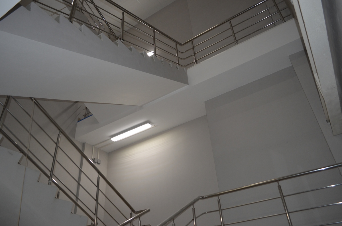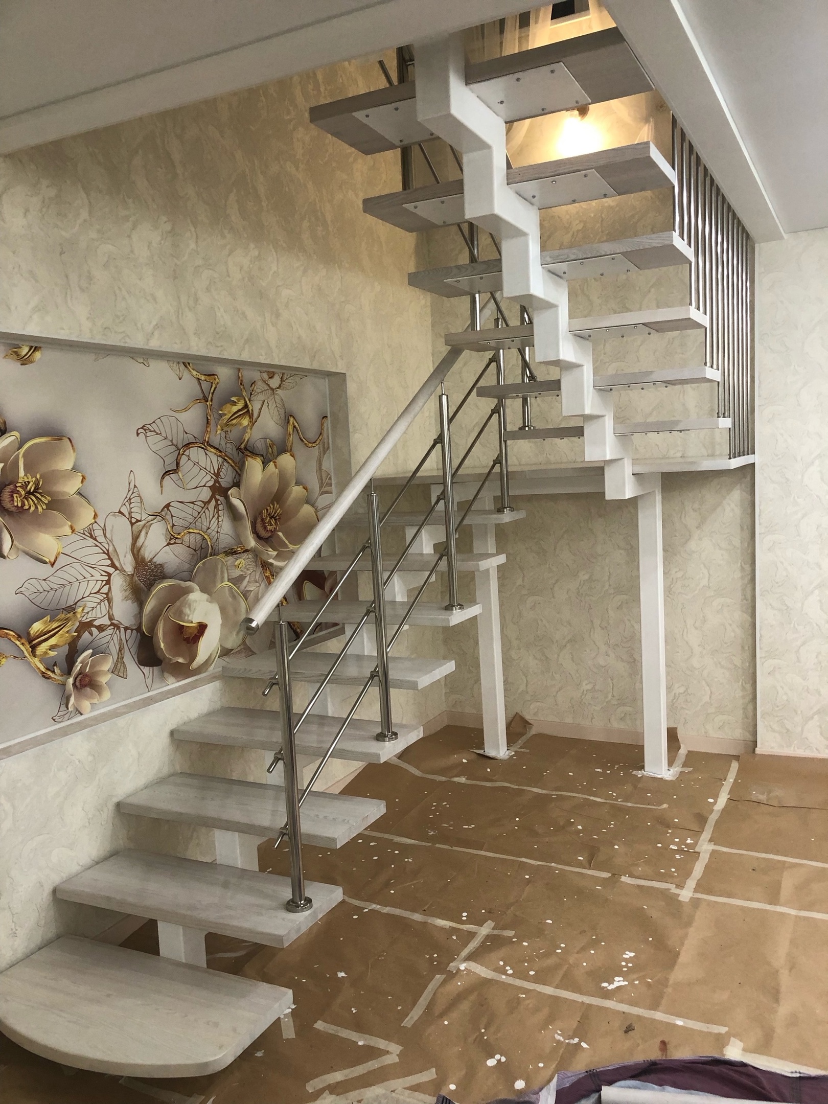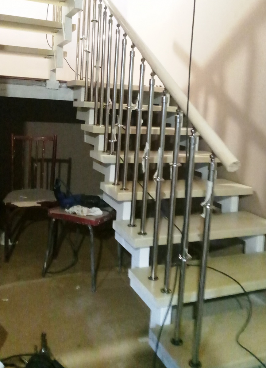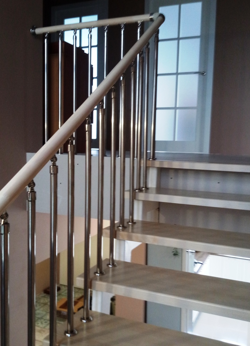 Отличная альтернатива полноценным нержавеющим перилам. Поручни из нержавеющей стали устанавливаются на стену параллельно лестничному маршу на расстоянии 5-7 см от стены.