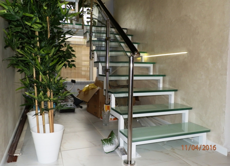 Лестницы, изготовленные на заказ со стеклянным ограждением, смотрятся весьма необычно. Материал создает впечатление, что конструкция прозрачная и легкая.