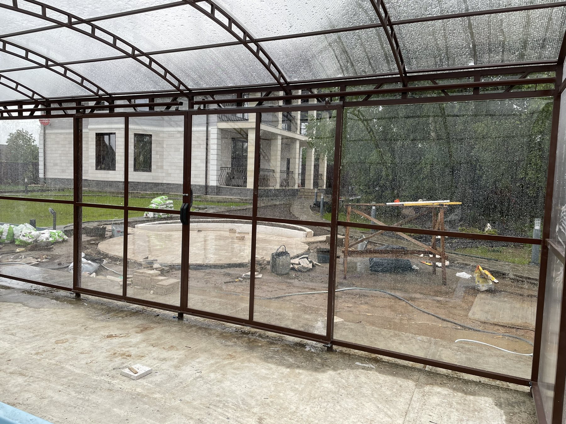 - с торца справа (монолитная часть поликарбоната) - будет входная дверь (тоже из монолитного поликарбоната), в положении “открыто” проход будет составлять около 3-х метров, высота – 2,05 метров (по ширине монолитного поликарбоната);