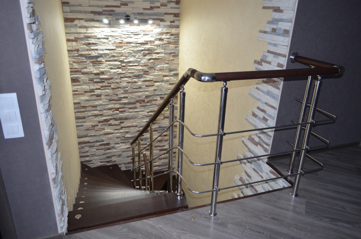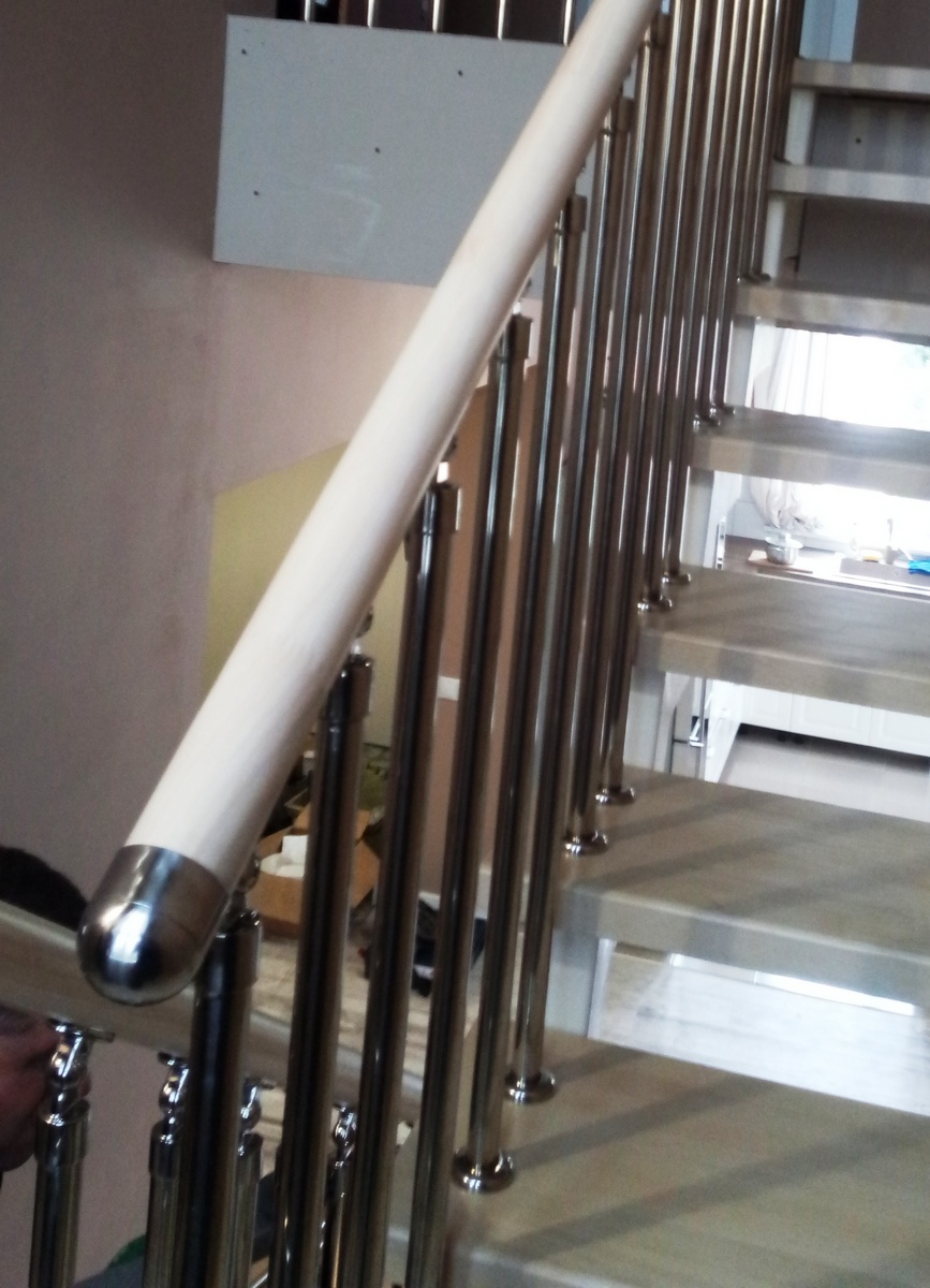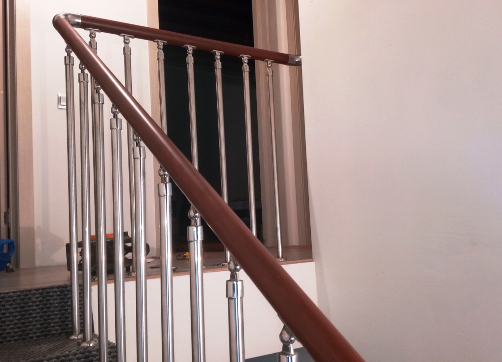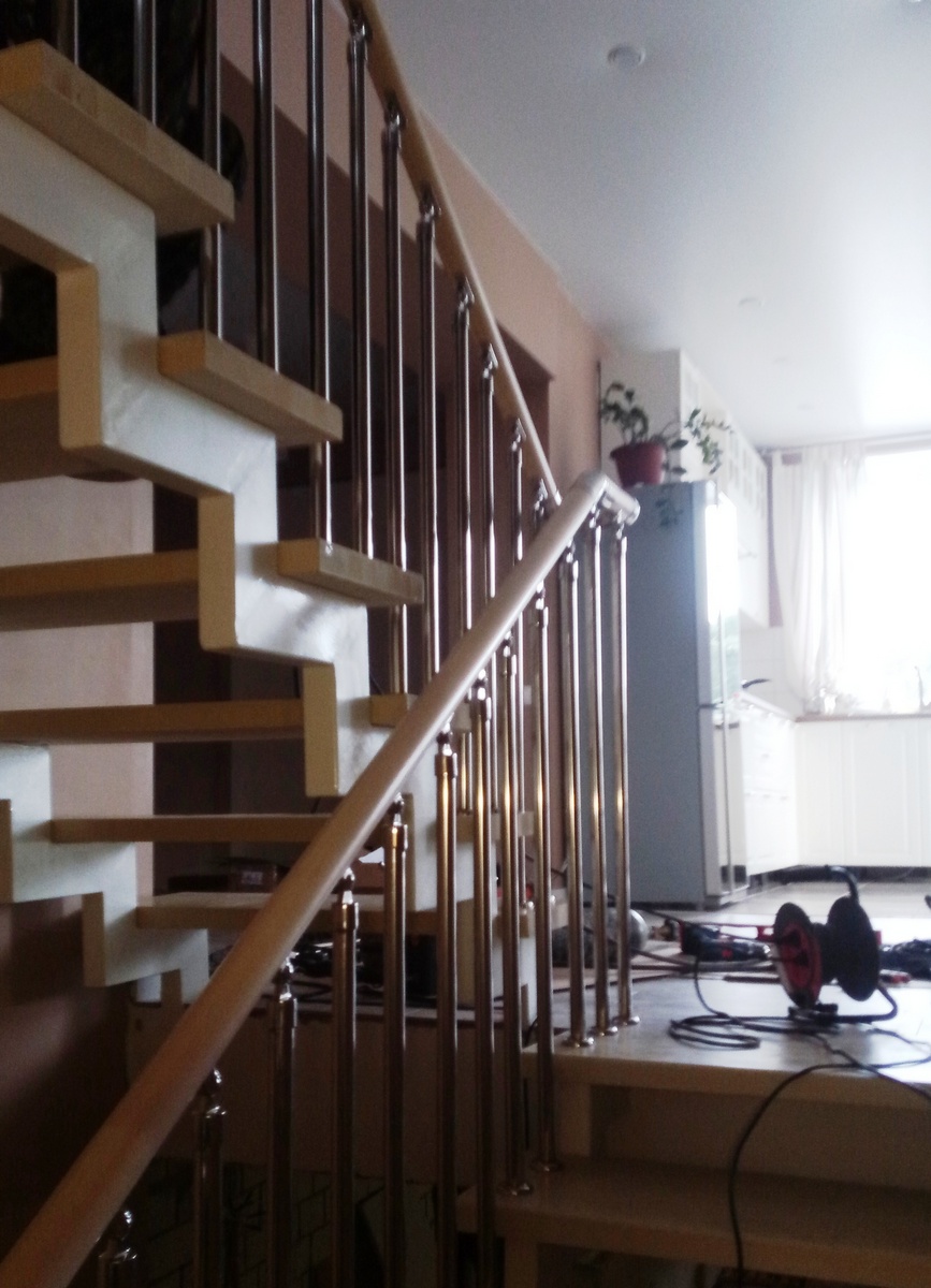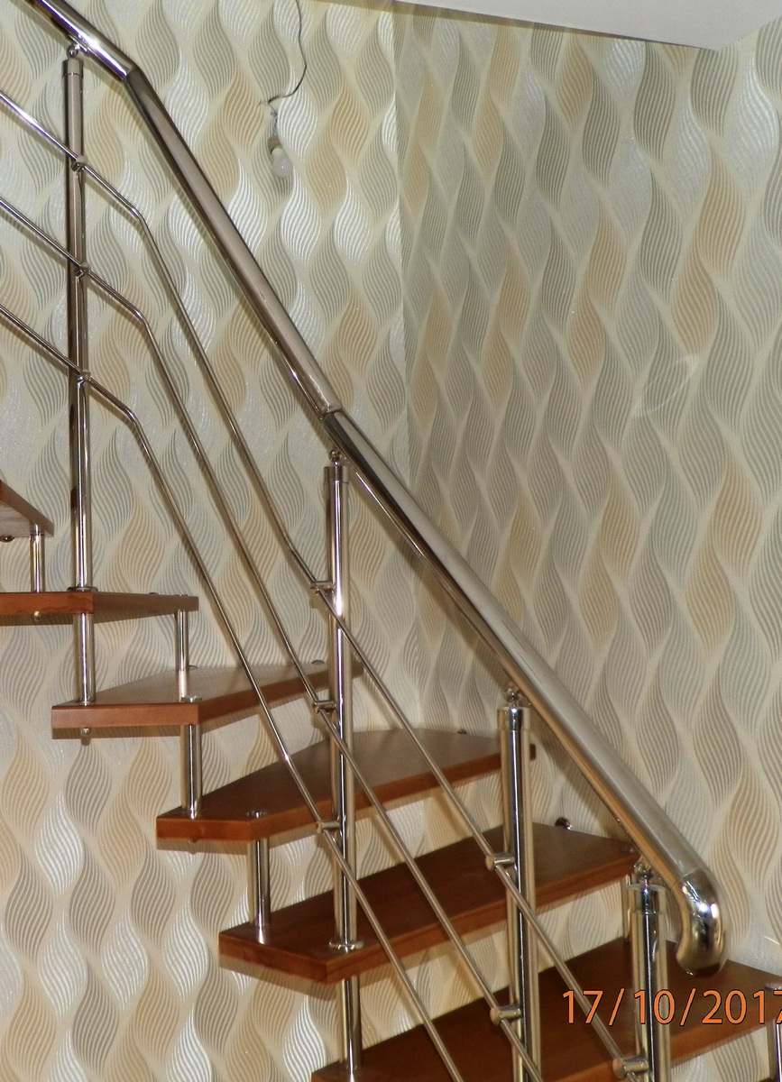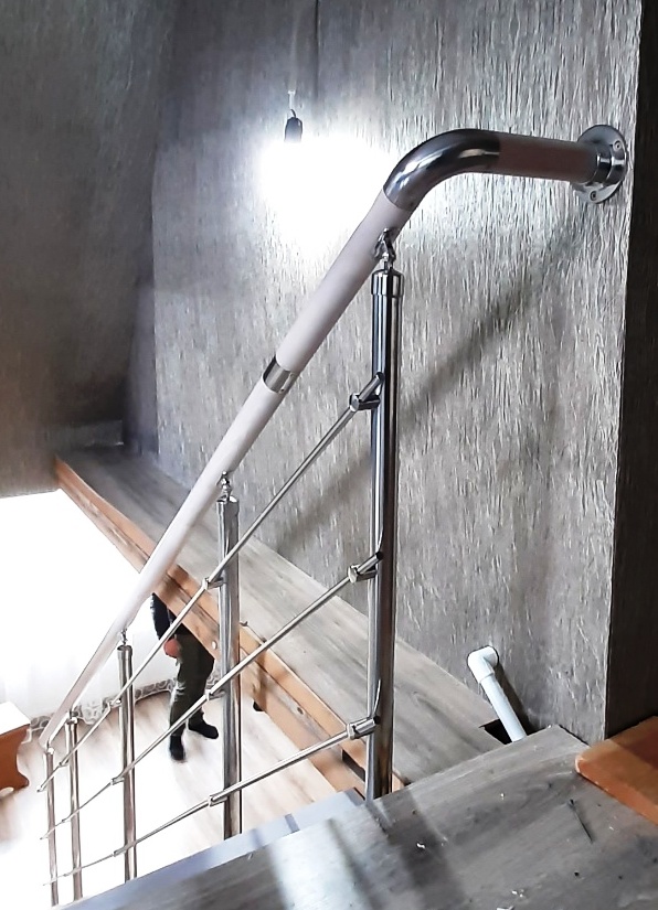 Отличная альтернатива полноценным нержавеющим перилам. Поручни из нержавеющей стали устанавливаются на стену параллельно лестничному маршу на расстоянии 5-7 см от стены.