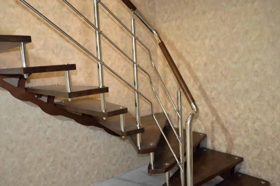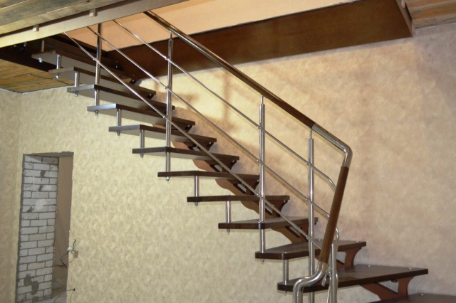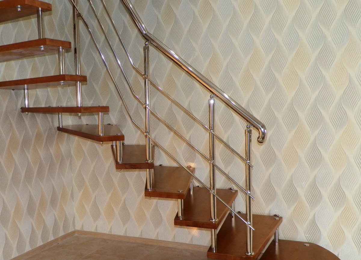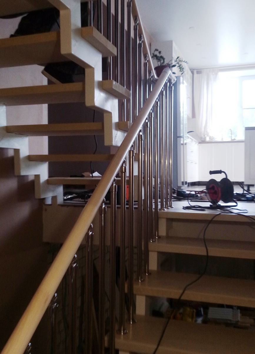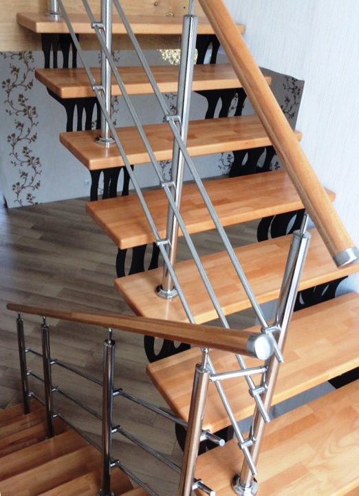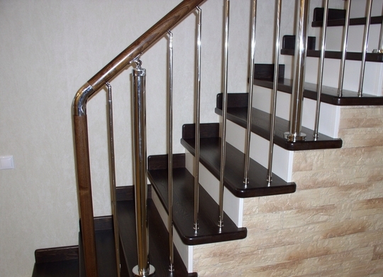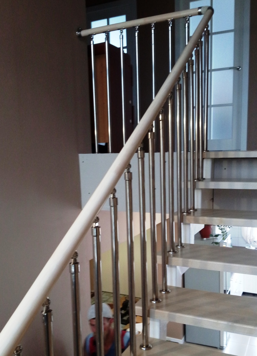 Отличная альтернатива полноценным нержавеющим перилам. Поручни из нержавеющей стали устанавливаются на стену параллельно лестничному маршу на расстоянии 5-7 см от стены.