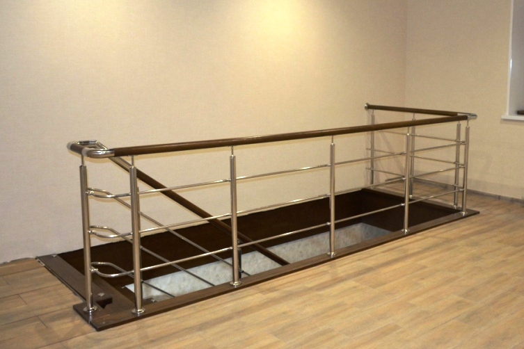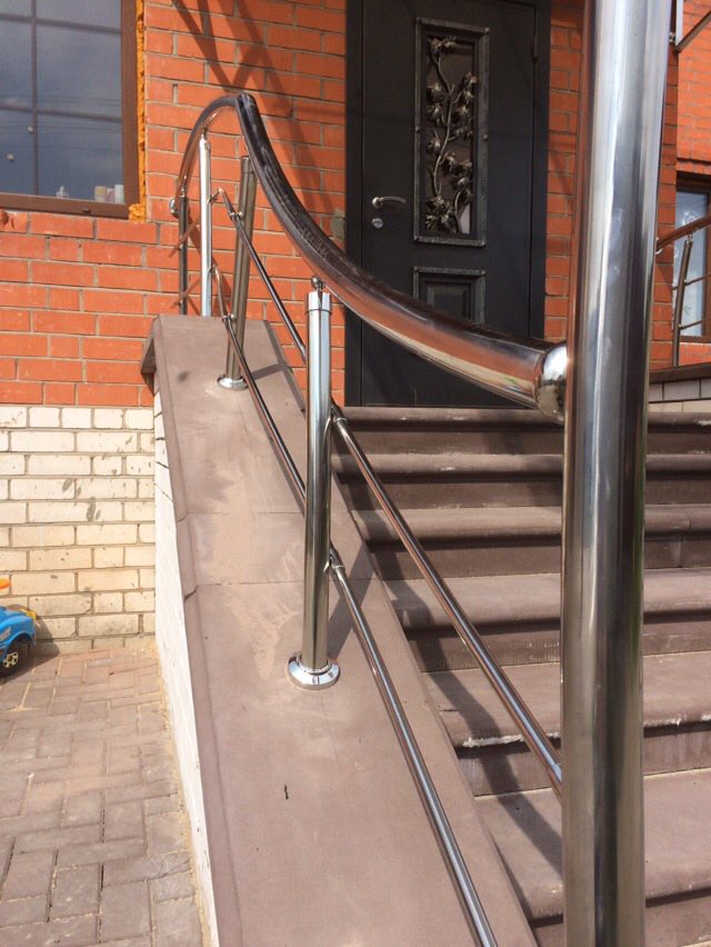 Высота верхнего поручня пандуса — 0,9 м, нижнего — от 0,7 м. Диаметр поручней до 50 мм. Количество струн (ригелей) оговаривается индивидуально с Заказчиком. Такие конструкции из нержавеющей стали обладают не только привлекательным внешним видом, но и обеспечивают функциональность и удобство пользования.
